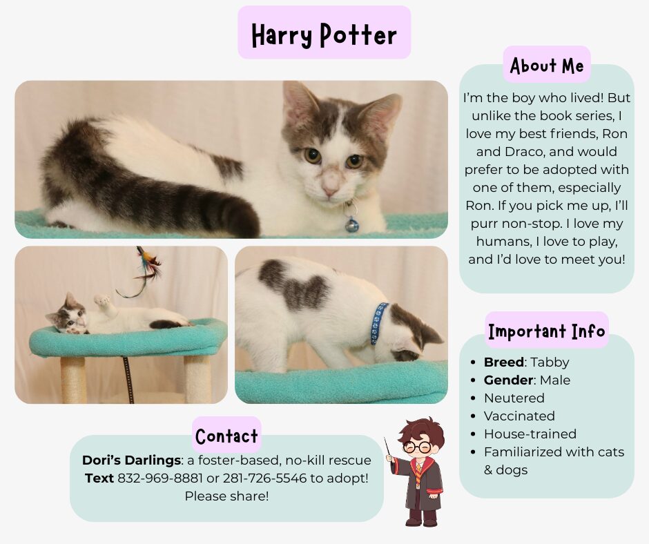 Harry Potter is our sweet wizard! He’s been with us for nearly a year now and we are shocked he hasn’t been adopted yet!